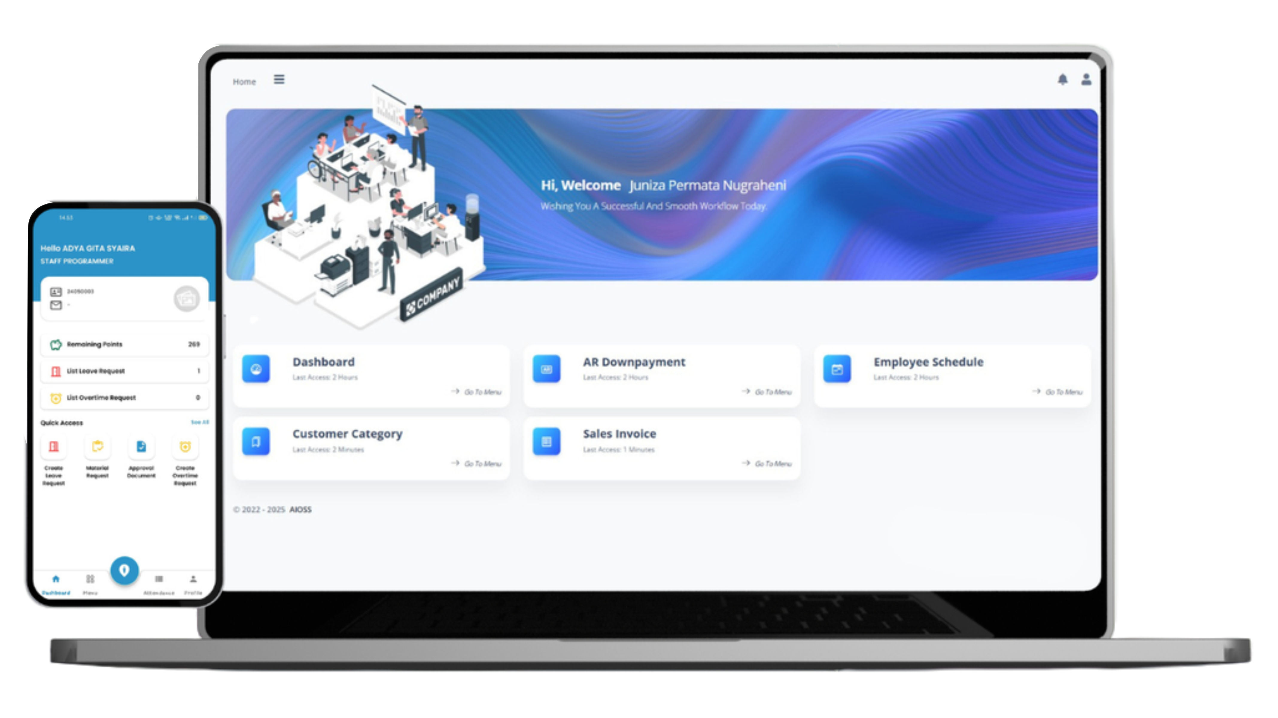 Aioss adalah aplikasi ERP berbasis web yang dirancang untuk mengakomodasi berbagai proses bisnis, termasuk Keuangan, Sumber Daya Manusia, Manajemen Inventaris, Pemeliharaan Rencana, Pengadaan, dan Manajemen Penjualan.